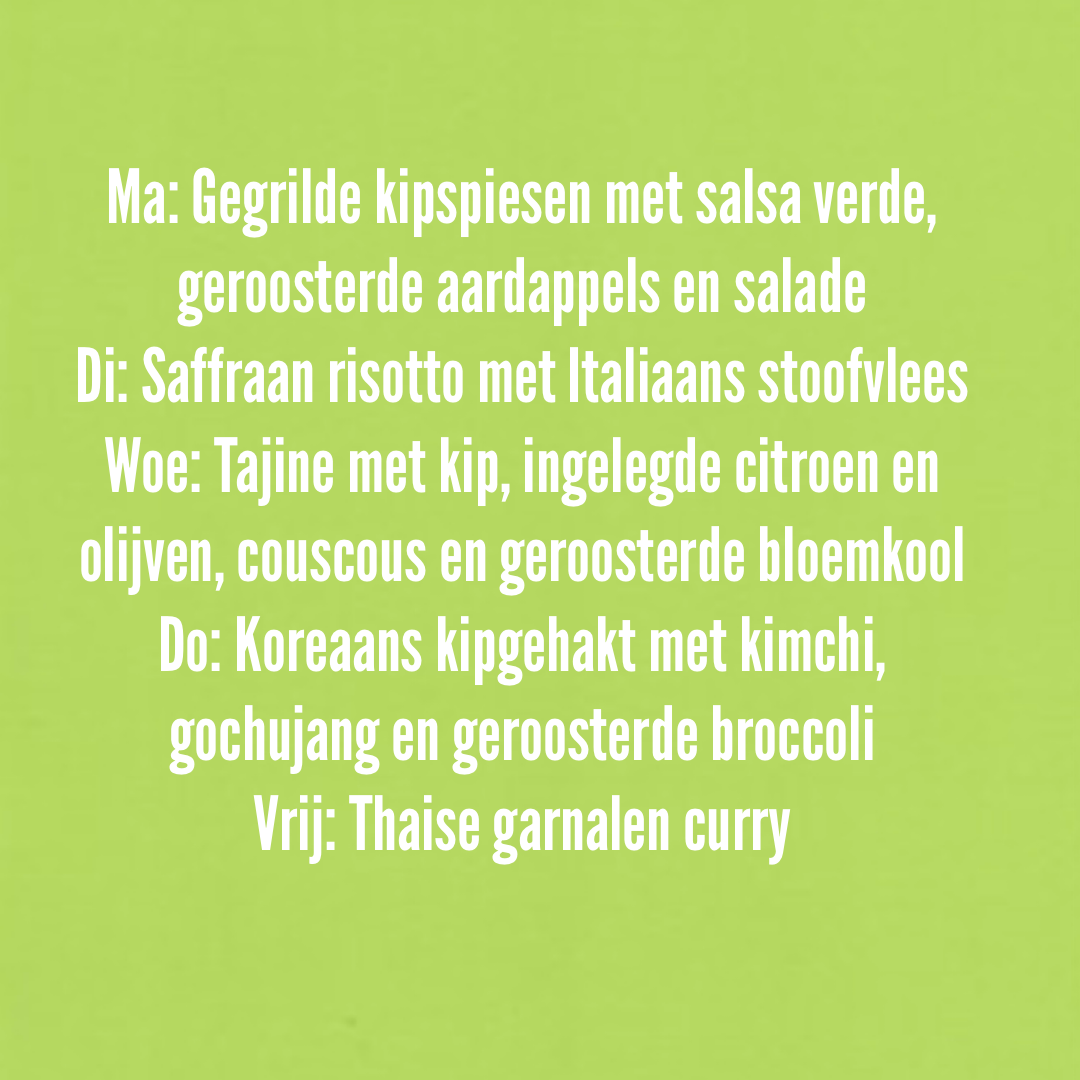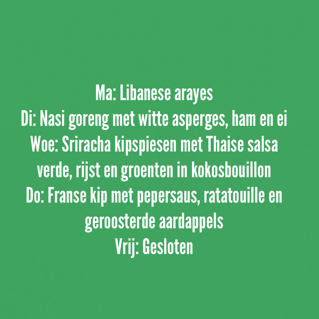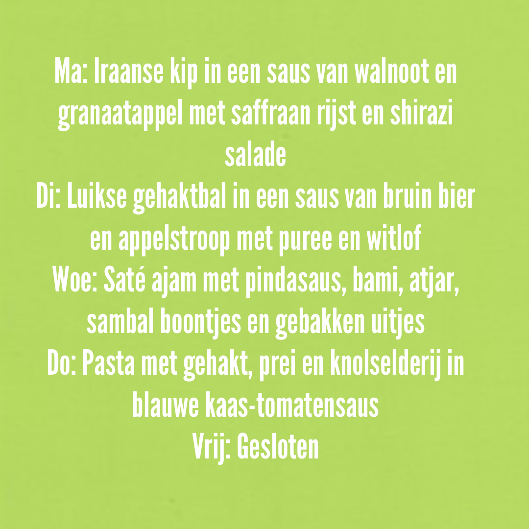 • Maandag t/m vrijdag een dagelijks variërende afhaalmaaltijd
