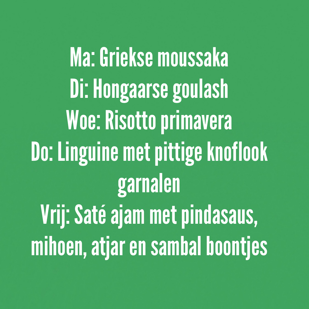 • Maandag t/m vrijdag een dagelijks variërende afhaalmaaltijd